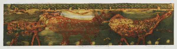 Klicka för att förstora bilden Hästars vandring Konstnär: Fia Kvissberg Mått: 13 x 50 cm Upplaga: 1 Teknik: djuptryck 2 400,00 kr 2 400,00 kr